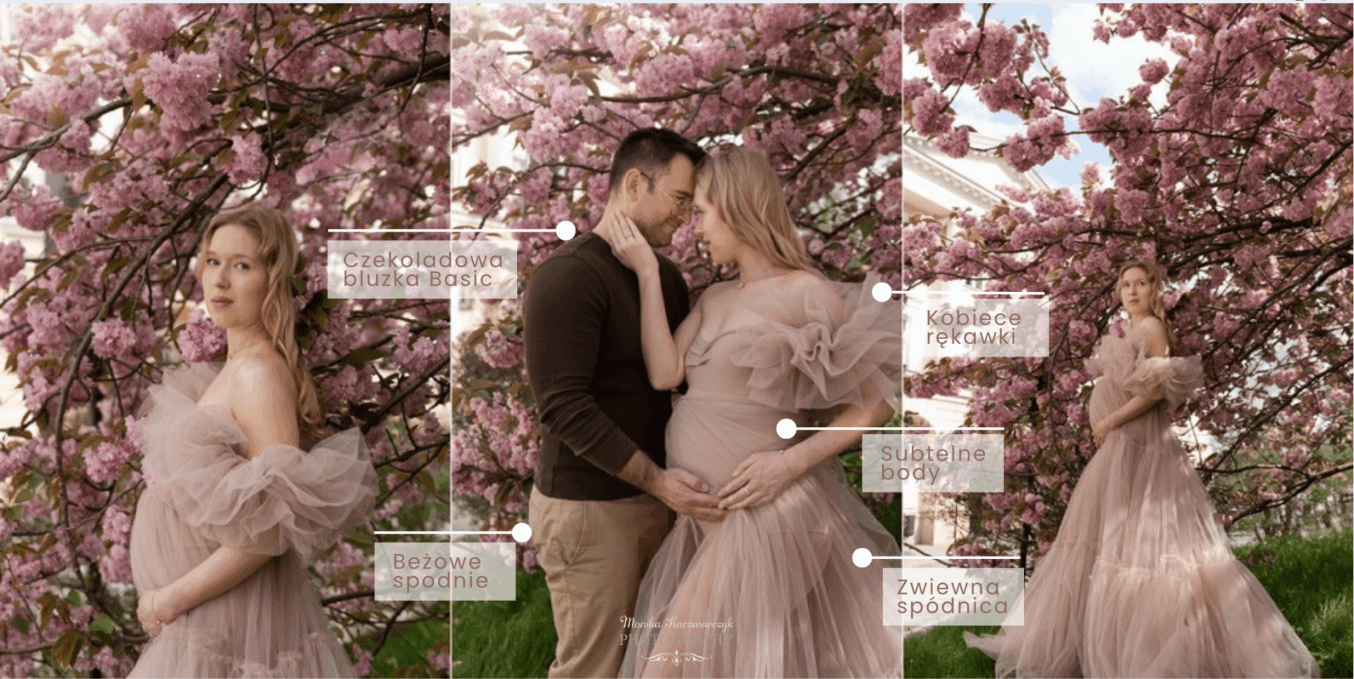 Spośród dostępnych stylizacji z mojej fotograficznej szafy, zaproponowałam Ani suknię ciążową w delikatnym odcieniu beżu, która składa się z body, tiulowych rękawków oraz lekkiej, tiulowej spódniczki. Cała stylizacja jest bardzo kobieca, eteryczna i idealnie pasuje do otoczenia kwitnących wiśni, nadając obrazom lekkość i magię.